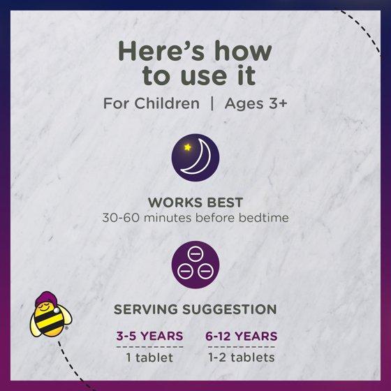 Zarbees kid's melatonin chewable tablet contains 1 mg of clinically studied melatonin to help promote peaceful sleep in kids ages 3 and up.* Our natural grape flavor, drug-free, easy-to-chew, non-habit-forming melatonin supplement works naturally with the body's sleep rhythm to safely and effectively help guide your child to sleep.* Our product is free of drugs, alcohol, artificial sweeteners, added flavors or dyes, and high fructose corn syrup. Zarbee’s is the #1 Pediatrician Recommended Sleep Support Brand for Children. Get the whole hive Zzzing: Check out our complete range of sleep products for kids, adults, and babies. *For occasional sleeplessness. *These statements have not been evaluated by the Food and Drug Administration. This product is not intended to diagnose, treat, cure, or prevent any disease.