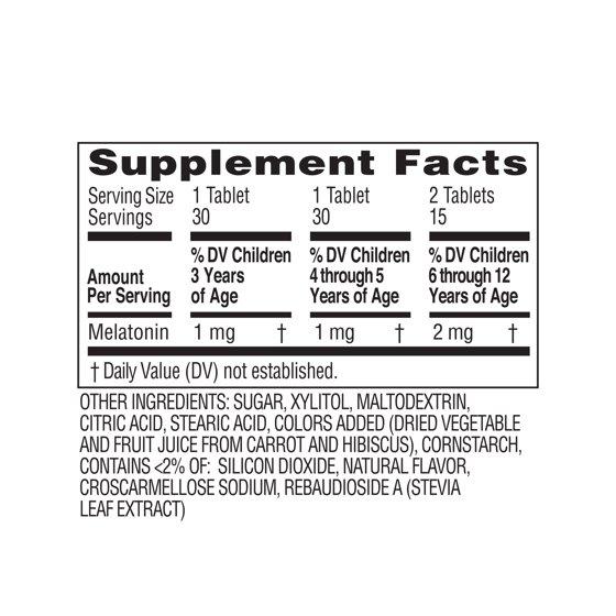 - Each chewable tablet has 1 mg of melatonin to help promote peaceful sleep in kids 3 years +*
