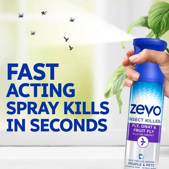 - Use on Flies, Gnats, Mosquitos and More: Zevo Flying Insect Spray is a versatile insect killer that can be used for targeted pest control. Spray it as a gnat or fruit fly killer, or to kill mosquitos or house flies on contact.