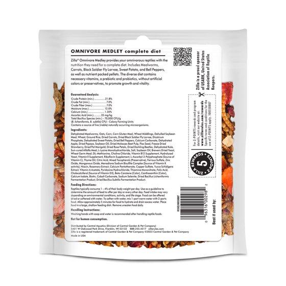- OPTIMAL NUTRITION FOR OMNIVOROUS REPTILES. Zilla Omnivore Medley provides a complete diet for omnivores like bearded dragons, box turtles, tegus and water dragons.