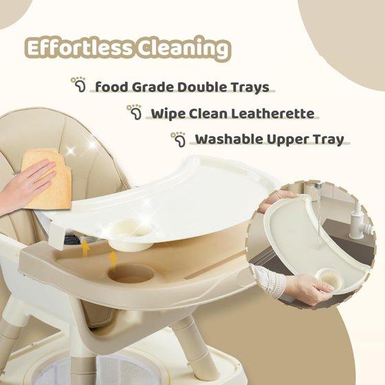 ●【Hygienic Dual-Layer Tray】Features a easy-clean meal zone and a locked play area to avoid spills, supported by a removable storage basket for organization.