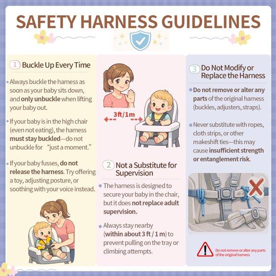- If your baby is in the high chair (even not eating), the harness must stay buckled—do not unbuckle for “just a moment.”