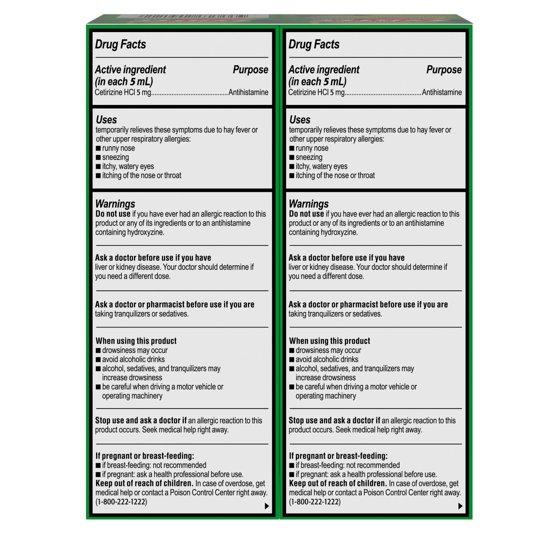 Active ingredient (in each 5 mL): Cetirizine HCl 5 mgPurpose antihistamineInactive ingredients: anhydrous citric acid, flavors, propylene glycol, purified water, sodium benzoate, sorbitol solution, sucralose