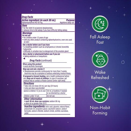 (in each 30 mL dose cup) Active Ingredients: Diphenhydramine HCl (50 mg), Nighttime Sleep-Aid. Inactive Ingredients: Citric Acid, Glycerin, Natural Flavor, Polysorbate 20, Propylene Glycol, Saccharin Sodium, Sodium Benzoate, Sodium Chloride, Sodium Citrate, Sorbitol Solution, Sucralose, Water.