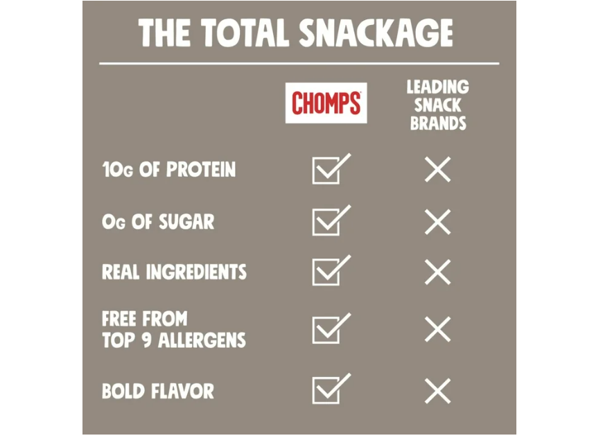 Chomps is a minority, family-owned and operated healthy meat snack brand with products made from the highest-quality proteins with no hidden, harmful ingredients. Chomps are zero sugar and never contain soy, dairy, artificial preservatives or colors, MSG, or artificial nitrates or nitrites. Additionally, Chomps is Whole30 Approved, certified gluten-free, and allergy-friendly. Each of Chomps beef sticks are filled with 100% non-GMO verified, grass-fed and grass-finished beef, 10g of protein, and only 100 calories. If you’re looking for a delicious on-the-go snack that’s packed with both protein and flavor, Chomps is the total snackage. So go ahead, take bigger bites!