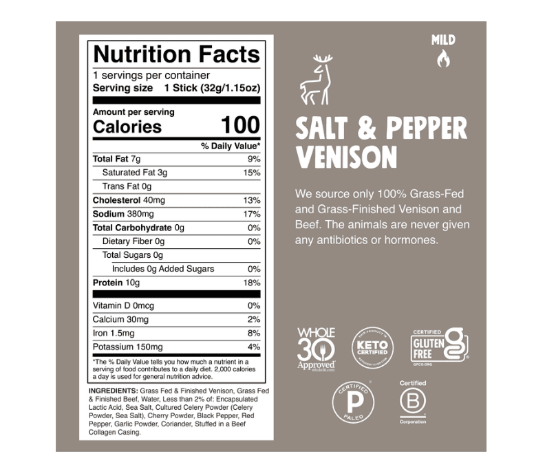 Total Snackage: Each satisfying 1.15 oz Salt & Pepper Venison Jerky meat snack stick is made with high quality, real ingredients, has 10 grams of protein, is a zero sugar food, and just 100 calories. The perfect snack you can feel good about anytime, anywhere.