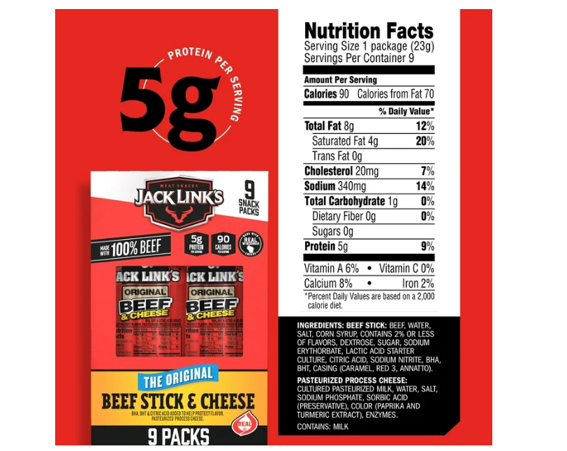 Beef Stick: Beef, Water, Salt, Corn Syrup, Contains 2% or Less of Flavors, Dextrose, Sugar, Sodium Erythorbate, Lactic Acid Starter Culture, Citric Acid, Sodium Nitrite, BHA, BHT, Casing (Caramel, Red 3, Annatto). Pasteurized Process Cheese: Cultured Pasteurized Milk, Water, Salt, Sodium Phosphate, Sorbic Acid (Preservative), Color (Paprika and Turmeric Extract), Enzymes.