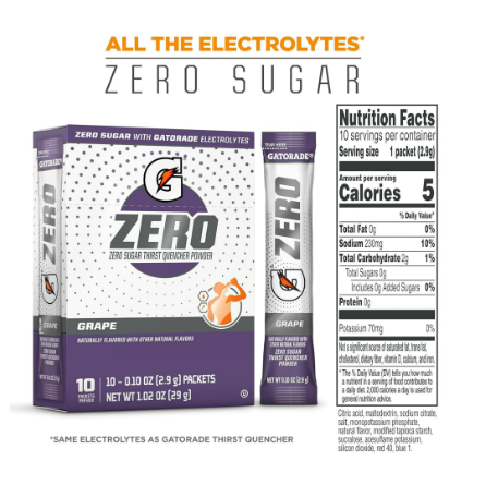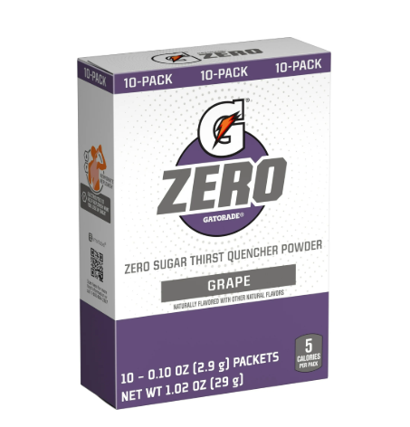 Includes 1 box with 10 Packets inside of Gatorade G Zero Sports Drink, Grape Flavor