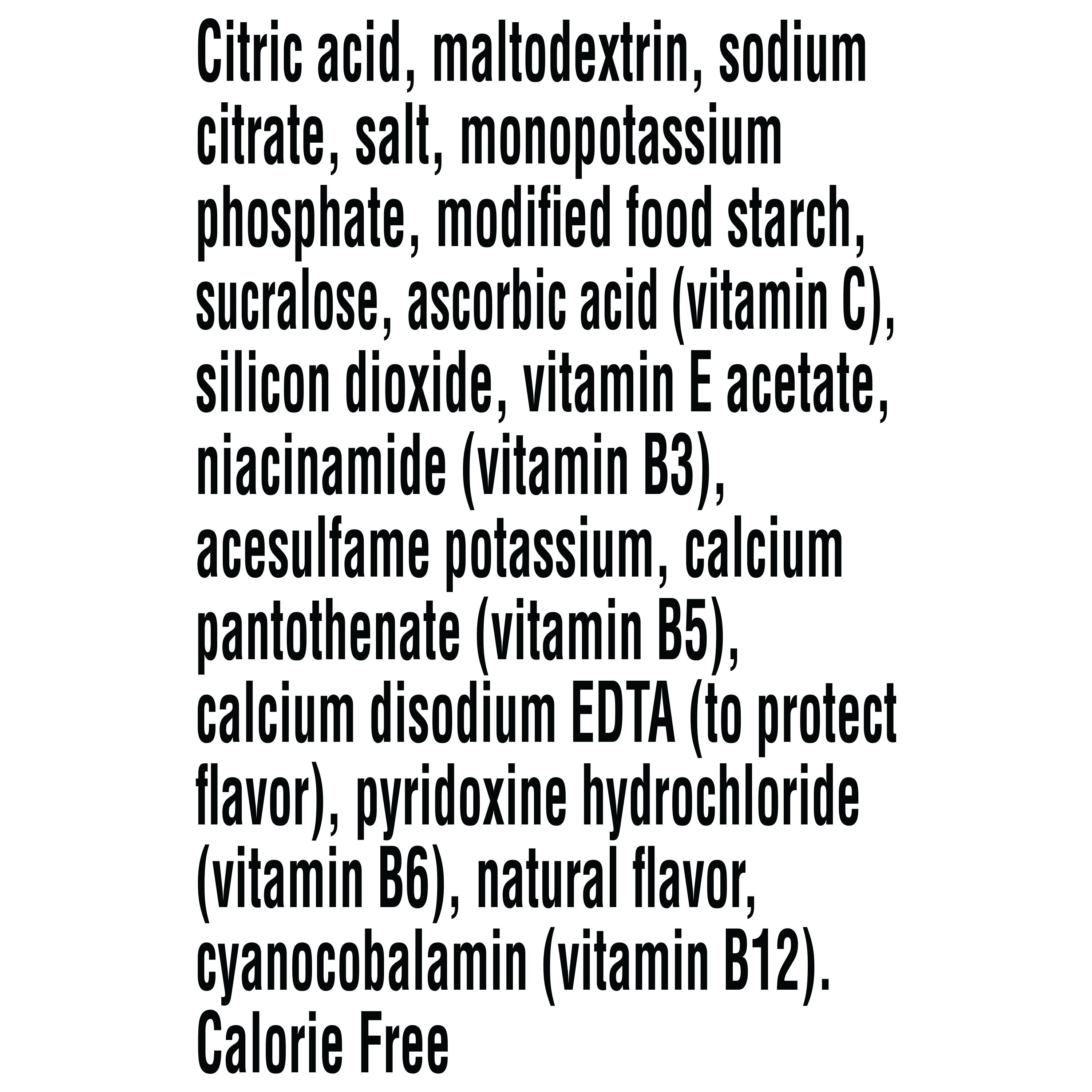 Citric Acid, Maltodextrin, Salt, Sodium Citrate, Monopotassium Phosphate, Ascorbic Acid (Vitamin C), Sucralose, Silicon Dioxide, Niacinamide (Vitamin B3), Acesulfame Potassium, Calcium Disodium EDTA (to Protect Flavor), Calcium Pantothenate (Vitamin B5), Vitamin E Acetate, Pyridoxine Hydrochloride (Vitamin B6), Natural Flavor, Cyanocobalamin (Vitamin B12).