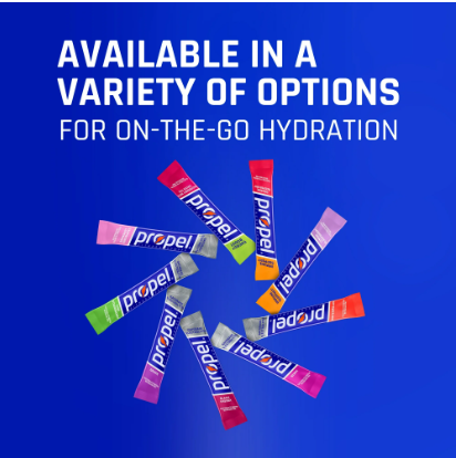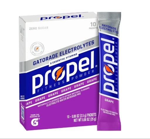 Flavored Fitness Water: Propel works harder to propel you along your fitness journey. Whether it’s running, biking, lifting, or surfing, Propel provides you with next level hydration to help you get the most out of your workout