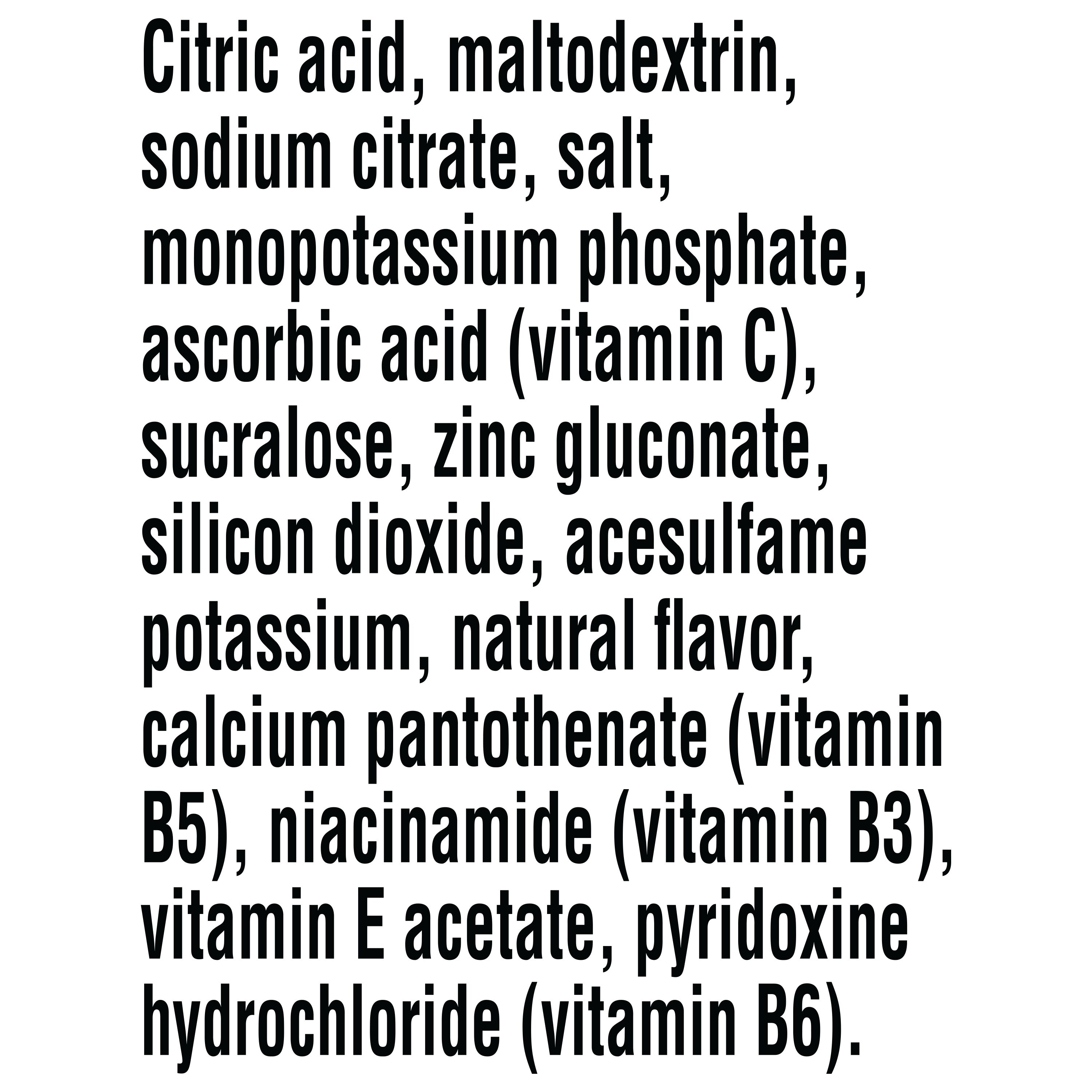 Citric Acid, Maltodextrin, Sodium Citrate, Salt, Monopotassium Phosphate, Ascorbic Acid (Vitamin C), Sucralose, Zinc Gluconate, Silicon Dioxide, Acesulfame Potassium, Natural Flavor, Calcium Pantothenate (Vitamin B5), Niacinamide (Vitamin B3), Vitamin E Acetate, Pyridoxine Hydrochloride (Vitamin B6).