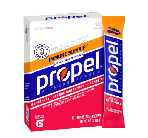 We are Propel Fitness Water – water that works harder to propel you along your fitness journey. We live and breathe to serve exercisers. Our “superpower” is our connection to Gatorade, and we fuel potential by pushing ourselves, each other, and our communities further.​ Propel Immune Support has 100% of the daily value of vitamin C and a good source of zinc to help support a healthy immune system, as well as Gatorade electrolytes, vitamins B6 and E with Zero Sugar. With Gatorade electrolytes, Propel fitness water helps to replace what you lose in sweat. ​