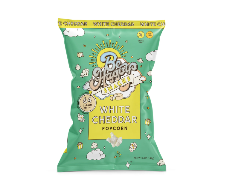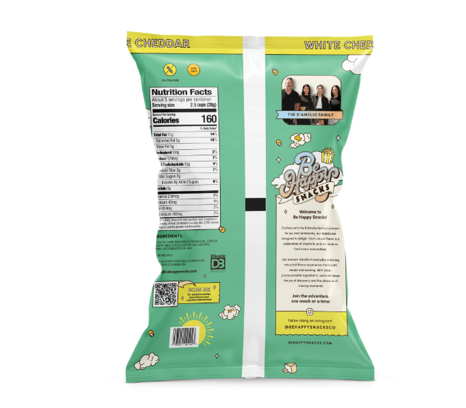 Welcome to Be Happy Snacks! Designed and loved by the D'Amelio family, we're all about sparking joy and satisfying cravings with fun, unexpected snacks that make your taste buds dance. Indulge in Cheesy Perfection from the comfort of your home with Be Happy Snacks 5 oz White Cheddar Popcorn. Gluten-Free. Meticulously coated with the finest cheddar for a snack that's truly unforgettable. Perfect for your summer gatherings with friends indulge in our snack that's cheesy, crunchy, and oh-so-satisfying!