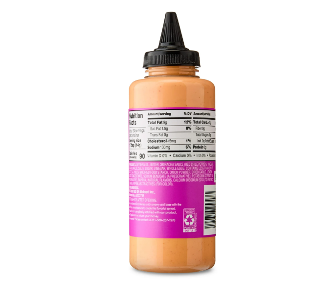 ​Soybean oil, water, srirachia sauce (red chile peppers, vinegar, sugar, garlic salt), sugar, vinegar, whole eggs, contains 2% or less than of salt, egg yolks, modiefied food starch, onion powder, dried garlic, lemon juice concentrate, sodium benzoate (a predervative), potassium sorbate (a preservative), paprika, natural flavors, calcium disodium edta (to protect flavor), paprika extractives (for color)
