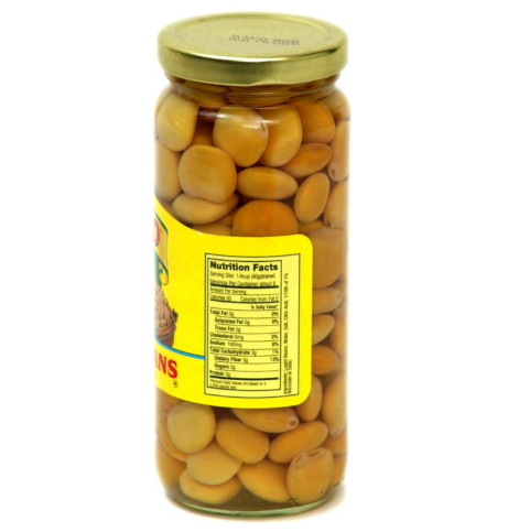 Lupini Beans, Water, Salt, Citric Acid, 1/10th of 1% Benzoate of Soda.