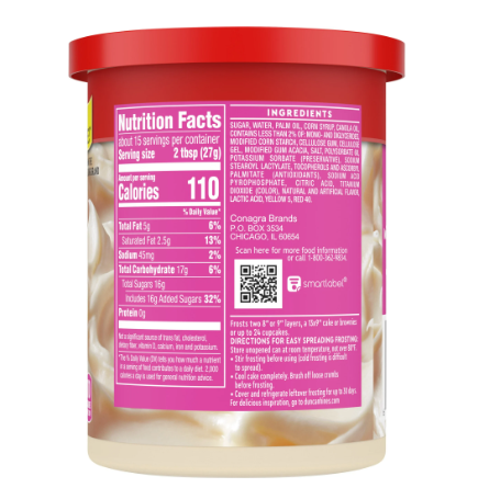 Generously frosts two 8'' or 9'' layers or 13'' x 9'' cake, brownies or up to 24 to 32 cupcakes. Directions for easy spreading frosting. ⦁ Stir room temperature frosting in can before using (cold frosting is difficult to spread). ⦁ Cool cake completely. Brush loose crumbs off cake before frosting. ⦁ Cover and refrigerate any remaining frosting for up to 2 weeks.