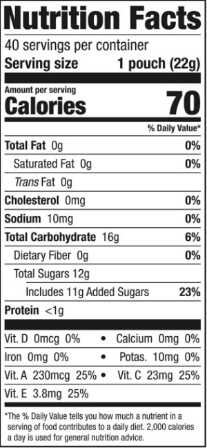 CORN SYRUP, SUGAR, APPLE PUREE CONCENTRATE, WATER, MODIFIED FOOD STARCH, GELATIN, CONTAINS 2% OR LESS OF CITRIC ACID, ASCORBIC ACID (VITAMIN C), FRUIT AND VEGETABLE JUICE (COLOR), VEGETABLE OIL (PALM, COCONUT)*, ALPHA TOCOPHEROL ACETATE (VITAMIN E), NATURAL FLAVORS, CARNAUBA WAX*, VITAMIN A PALMITATE.*ADDS A TRIVAL AMOUNT OF FAT.