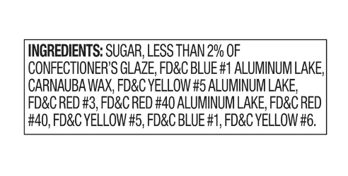 Sugar, less than 2% of confectioner's glaze, FD&C blue #1 aluminum lake, carnuba wax, FD&C yellow #5 aluminum lake, FD&C red #3, FD&C red #40 aluminum lake, FD&C red #40, FD&C yellow #5, FD&C blue #1, FD&C yellow #6
