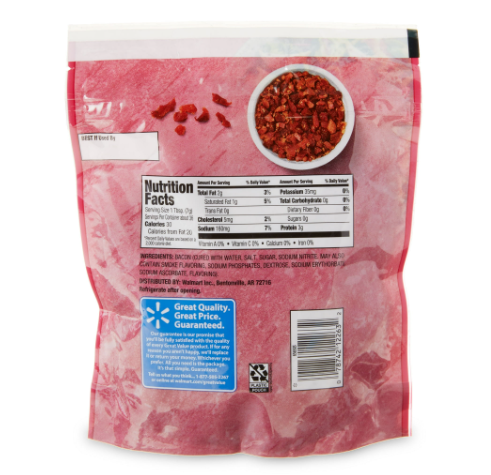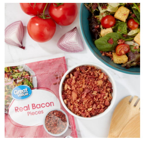 Take your culinary creations to the next level with our yummy, chewy Great Value Real Bacon Pieces. Our real pork bacon pieces are packed with protein in every serving. Top off a Caesar salad, add a salty crunch to a loaded baked potato with sour cream, shredded cheddar cheese, and chives, or simply enjoy by the handful straight from the bag. Great Value Real Bacon Pieces are also an excellent snacking option when you're on the go and need a little extra protein boost to power through your day. They're a kitchen staple every home chef should have on hand. Add some flavor to your next meal with our Great Value Real Bacon Pieces.