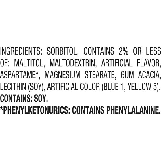 SORBITOL, CONTAINS 2% OR LESS OF: MALTITOL, MALTODEXTRIN, ARTIFICIAL FLAVOR, ASPARTAME*, MAGNESIUM STEARATE, GUM ACACIA, LECITHIN (SOY), ARTIFICIAL COLOR (BLUE 1, YELLOW 5).