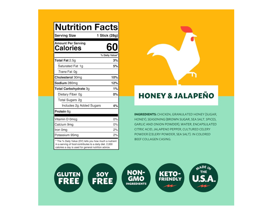 Chicken, Granulated Honey (Sugar, Honey), Seasoning (Brown Sugar, Sea Salt, Spices, Garlic and Onion Powder), Water, Encapsulated Citric Acid, Jalapeno Pepper, Cultured Celery Powder (Celery Powder, Sea Salt), in Colored (Annatto) Beef Collagen Casing.