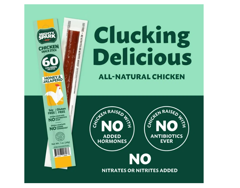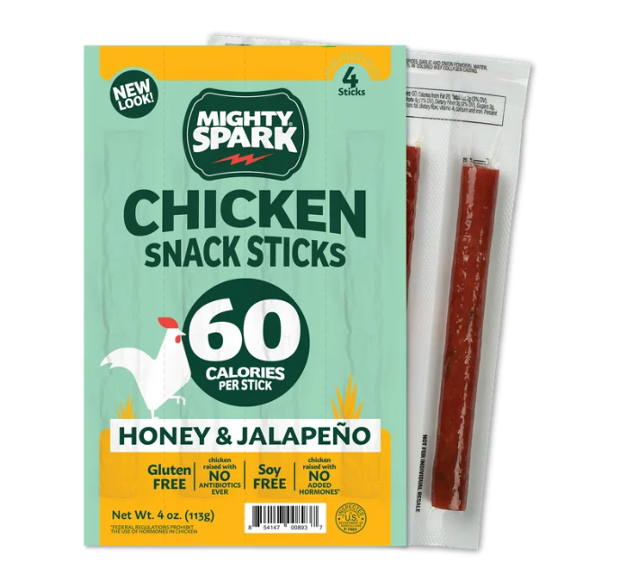 Contains 4- 1 oz Mighty Spark Honey & Jalapeno Chicken Snack Sticks