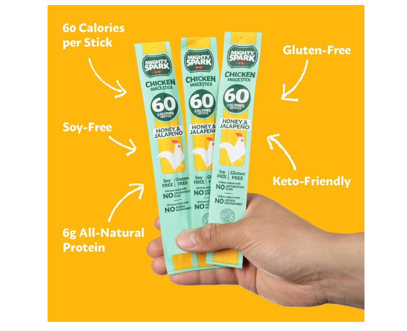 Mighty Spark Honey & Jalapeno Chicken Snack Sticks feature a sweet flavor with a touch of heat, making them a delicious solution for your next hunger emergency. Hand-crafted from simple and honest ingredients, we use only premium cuts of all-natural chicken raised with no antibiotics and no added hormones. This pack includes four, 1-ounce snack sticks, so they are the ideal on-the-go snack for road trips, kids’ lunches, or to have on hand at your desk. These savory chicken sticks are not only delicious and convenient, but they are nutritious too! Each stick is only 60 calories and is free from the top 9 allergens.