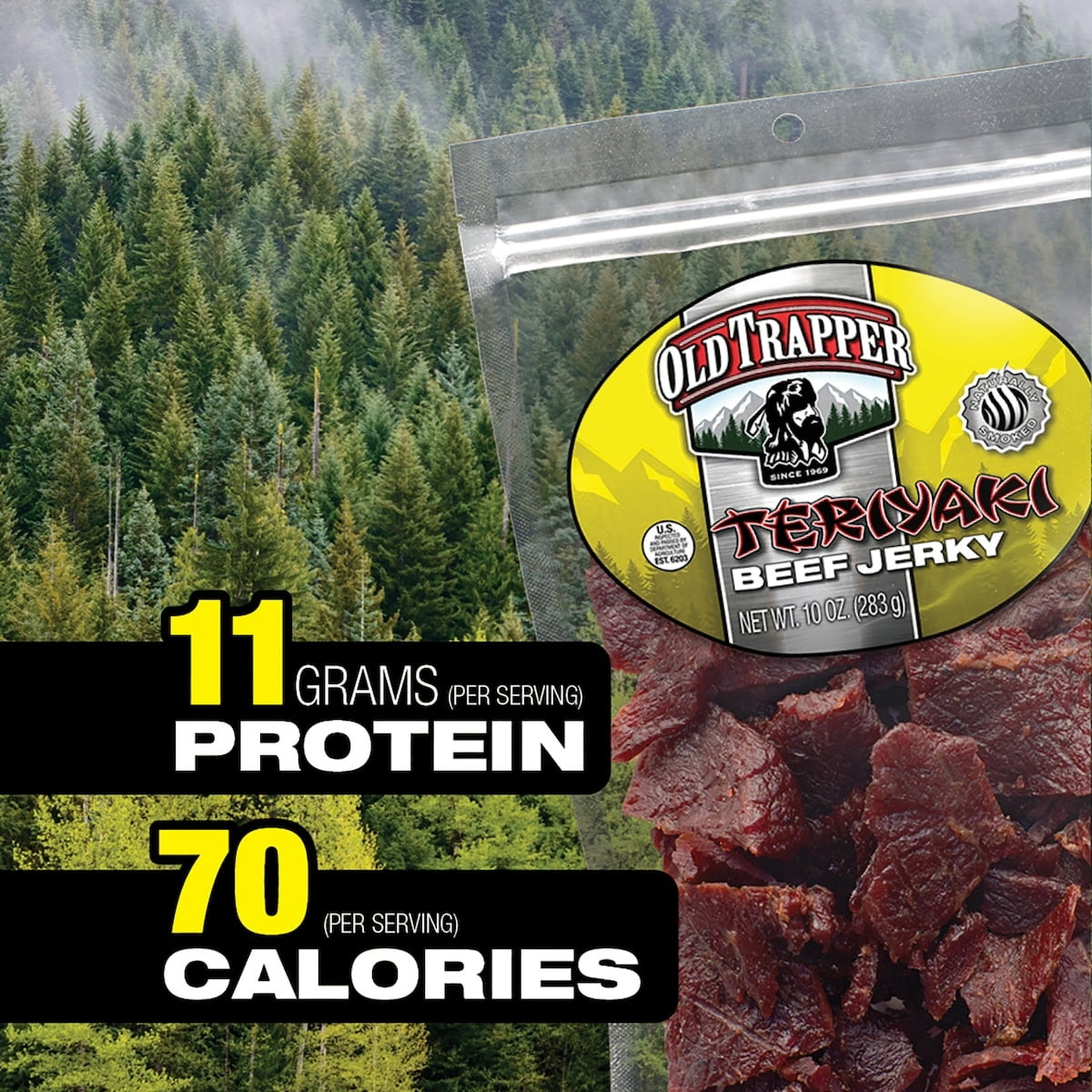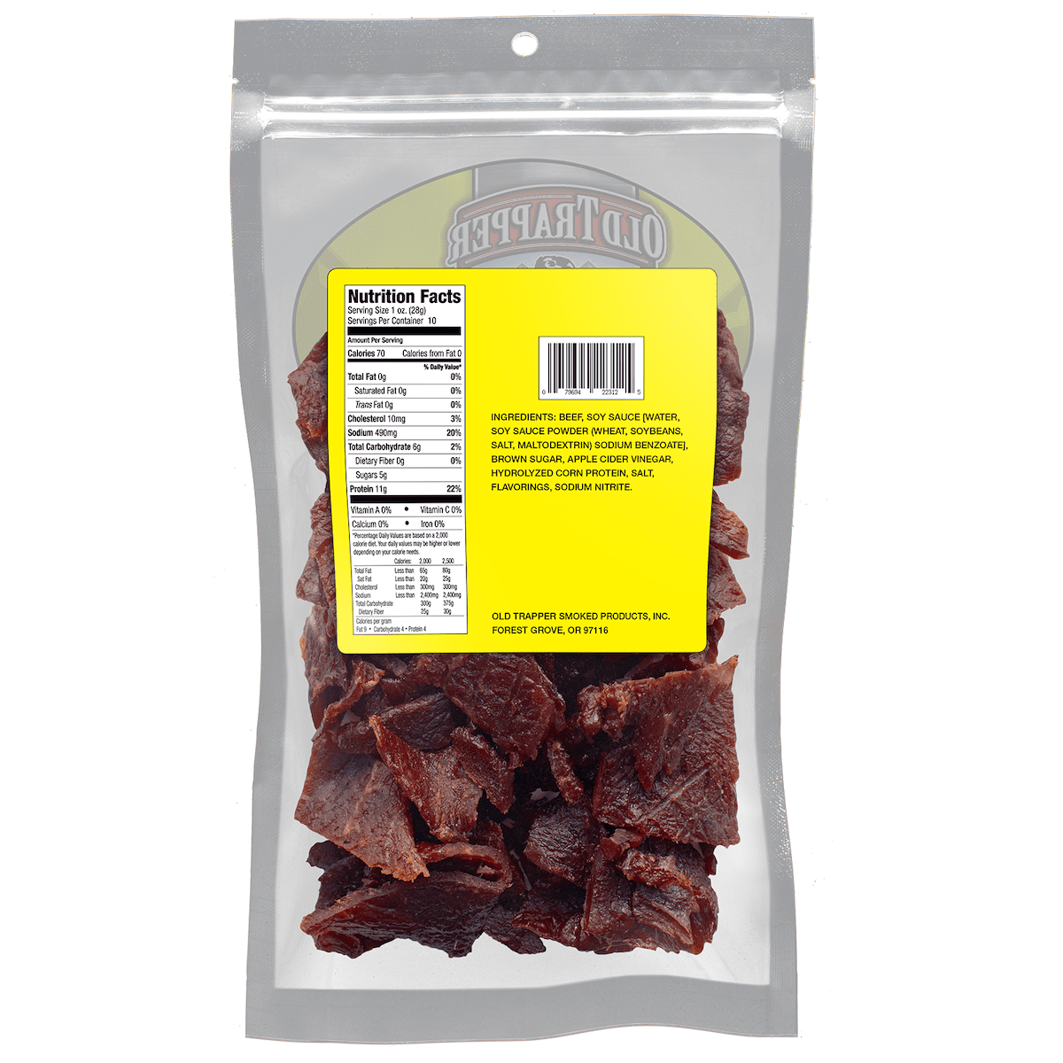 Treat your taste buds to Old Trapper Peppered Teriyaki Jerky. It is naturally smoked and has no fat or cholesterol. This bag contains approximately 10 oz of Old Trapper beef jerky.