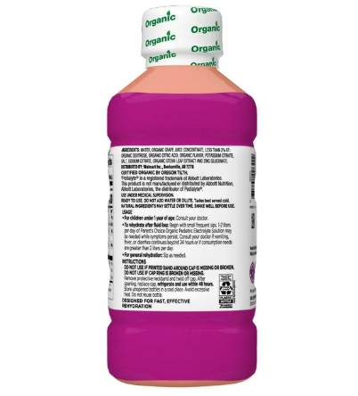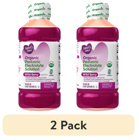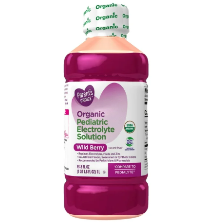Compare to Pedialyte. Parent's Choice Organic Pediatric Electrolyte Oral Solution Wild Berry is designed to help prevent dehydration by restoring fluids and electrolytes more effectively than sports drinks, sodas, juices and water. Use for rehydration to replenish electrolytes, fluids and zinc after vomiting and diarrhea, intense exercise, heat exhaustion or travel. USDA Certified organic. Made with no artificial flavors, sweeteners or synthetic color. Great for kids and adults. Recommended by pediatricians and pharmacists. Non-GMO ingredients not genetically engineered. Wild Berry natural flavor. Pedialyte is a registered trademark of Abbott Laboratories. This product is not manufactured or distributed by Abbott Nutrition, Abbott Laboratories, the distributor of Pedialyte. Shelf stable. Age group: child