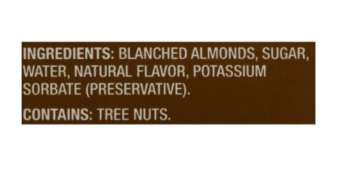 Blanched Almonds, Sugar, Water, Natural Flavor, Potassium Sorbate (Preservative).