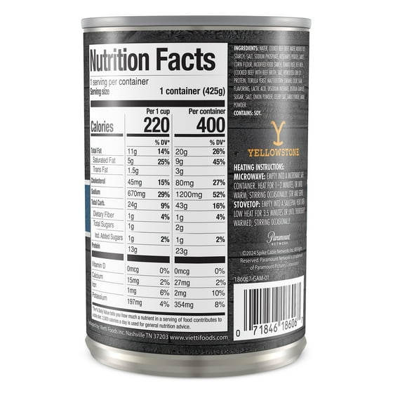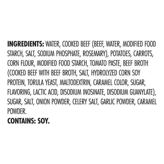 Water, cooked beef (beef, water, modified corn starch, salt, sodium phosphate, rosemary), potatoes, carrots, corn flour, modified corn starch, tomato paste, beef broth (cooked beef with beef broth, salt, hydroluyzed corn soy protein, torula yeast, maltodextrin, caramel color, sugar, flavoring, lactic acid, disodium inosinate, disodium guanylate), sugar, salt, onion powder, celery salt, garlic powder, caramel