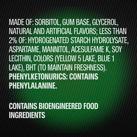 Made of: Sorbitol, Gum Base, Glycerol, Natural and Artificial Flavors; Less than 2% of: Hydrogenated Starch Hydrolysate, Aspartame, Mannitol, Acesulfame K, Soy Lecithin, Colors (Yellow 5 Lake, Blue 1 Lake), BHT (to Maintain Freshness).