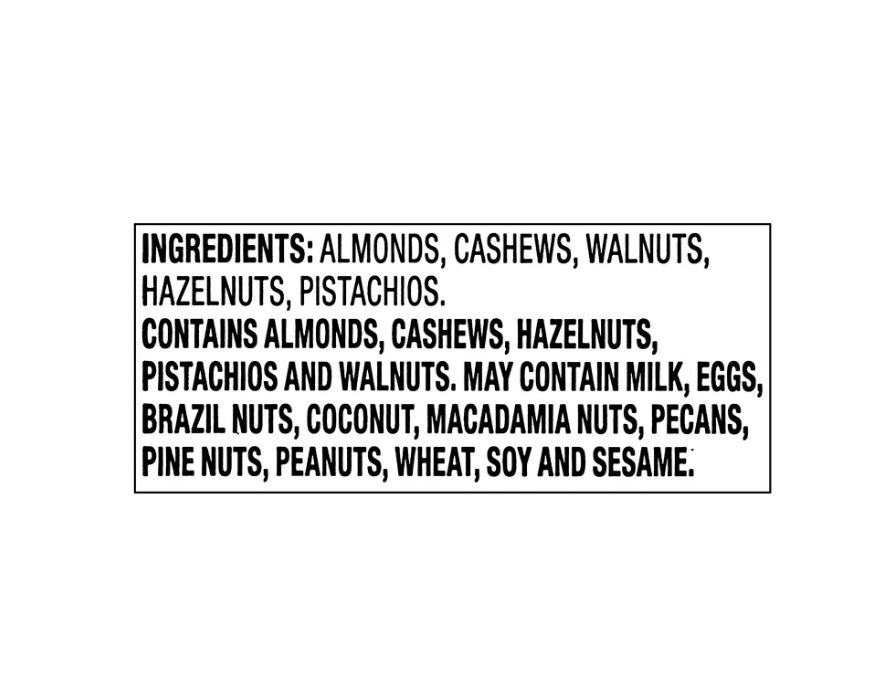 CONTAINS ALMONDS, CASHEWS, HAZELNUTS, PISTACHIOS AND WALNUTS. MAY CONTAIN MILK, EGGS, BRAZIL NUTS, COCONUT, MACADAMIA NUTS, PECANS, PINE NUTS, PEANUTS, WHEAT, SOY AND SESAME.
