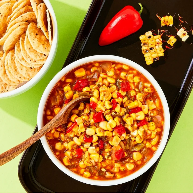 A sweet and spicy, no-tomato blend of chiles and peppers with whole corn pieces