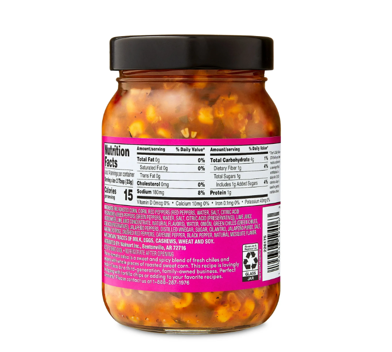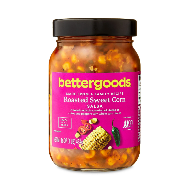 bettergoods Roasted Corn Salsa, Medium, Shelf Stable, 16 oz Glass Jar. Take your taste buds on a tantalizing journey with the bettergoods Roasted Corn Salsa. Our sweet and spicy no-tomato salsa features a blend of fresh chiles and peppers with whole pieces of roasted sweet corn. Whether you're craving a quick snack or planning to elevate a recipe, this mild salsa is an exceptional choice. Enjoy it as a dip for tortilla chips and veggie sticks, drizzle it over fresh fish tacos, or use it to whip up a tasty dressing for your favorite salad. Embrace the versatility of our bettergoods Roasted Corn Salsa and let your culinary creativity run wild. Shelf stable in storage, refrigerate after opening. May contain traces of milk, eggs, cashews, wheat and soy.