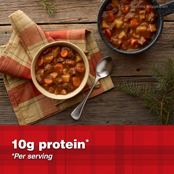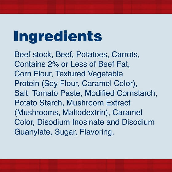 Ingredients: Beef Stock, Beef, Potatoes, Carrots, Contains 2% or less of Beef Fat, Corn Flour, Textured Vegetable Protein (Soy Flour, Caramel Color), Salt, Tomato Paste, Modified Cornstarch, Potato Starch, Mushroom Extract (Mushrooms, Maltodextrin), Caramel Color, Disodium Inosinate and Disodium Guanylate, Sugar, Flavoring.