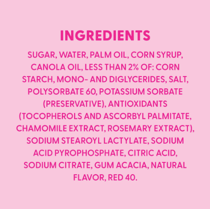 Sugar, Water, Palm Oil, Corn Syrup, Canola Oil, Less than 2% of: Corn Starch, Mono- and Diglycerides, Salt, Polysorbate 60, Potassium Sorbate (Preservative), Antioxidants (Tocopherols and Ascorbyl Palmitate, Chamomile Extract, Rosemary Extract), Sodium Stearoyl Lactylate, Sodium Acid Pyrophosphate, Citric Acid, Sodium Citrate, Gum Acacia, Natural Flavor, Red 40