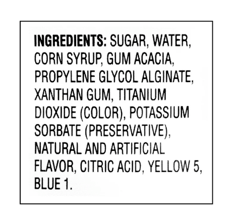 Sugar, Water, Corn Syrup, Gum Acacia, Propylene Glycol Alginate, Xanthan Gum, Titanium Dioxide (Color), Potassium Sorbate (Preservative), Natural And Artificial Flavor, Citric Acid, Yellow 5, Blue 1.