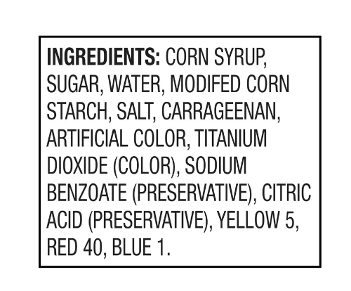 Corn Syrup, Sugar, Water, Modified Corn Starch, Salt, Carrageenan, Artificial Color, Titanium Dioxide (Color), Sodium Benzoate (Preservative), Citric Acid (Preservative), Yellow 5, Red 40, Red 1.