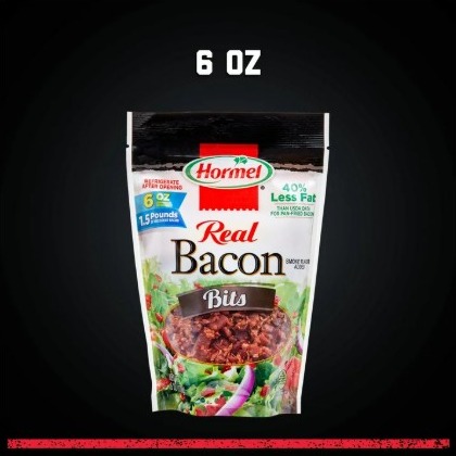 HORMEL Real Bacon Bits add flavor to all your bacon-inspired dishes. Want the convenience of bacon flavor without the mess of cooking raw bacon? Our Bacon Bits come in an easy resealable plastic pouch so you can sprinkle some on your sour cream topped baked potato or try it on your favorite egg dish! HORMEL Real Bacon Bits has 25 calories and 3 grams of protein per serving and contains 40 percent less fat than USDA data suggests for pan-fried bacon giving you less fat without ditching flavor. It's shelf stable and strikingly handsome on all your favorite dishes like baked potatoes, salads, pizza, omelets, and more. For over 100 years, our cuts of pork bacon have always been cutting edge. That's the HORMEL brand difference your taste buds will appreciate. Includes one 6 oz plastic package of HORMEL Real Bacon Bits. Safe handling: Refrigerate after opening. All trademarks, logos and images are owned by Hormel Foods Corporation, its subsidiaries and affiliates. Copyright Hormel Foods, LLC.