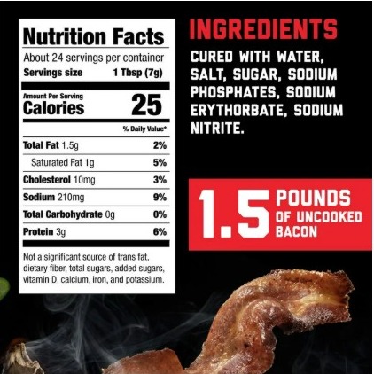 Packet enclosed to keep product fresh. Do not eat packet.Package is equipment to approximately 2 pounds of uncooked bacon. 1 tbsp is equivalent to 1 slice of fully cooked bacon.