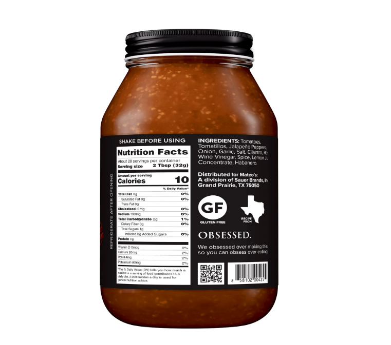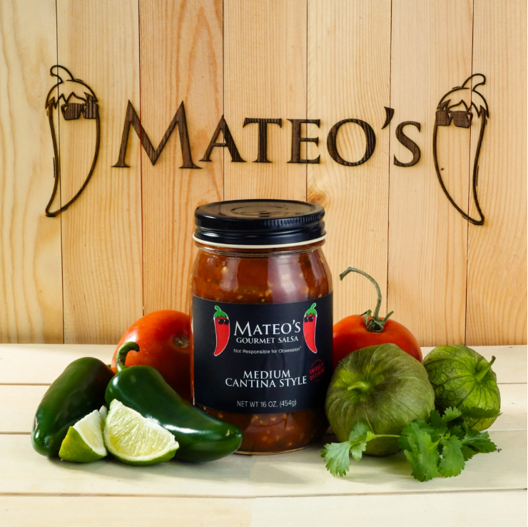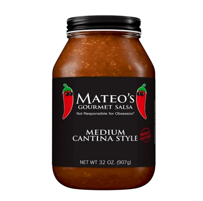 Mateo's Gourmet Cantina 16 oz of all-natural gourmet salsa per bottle; Medium Heat; Not responsible for obsession; Product of Frisco, Texas