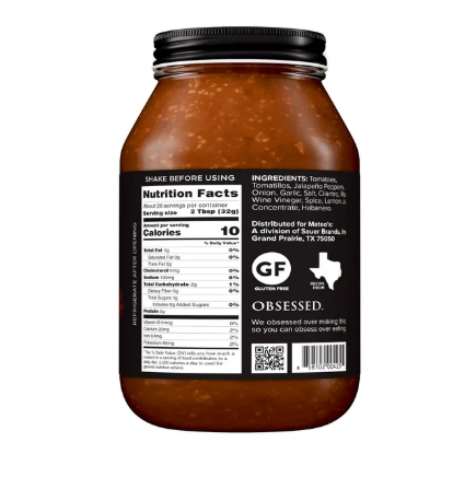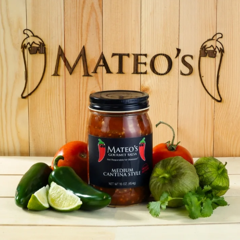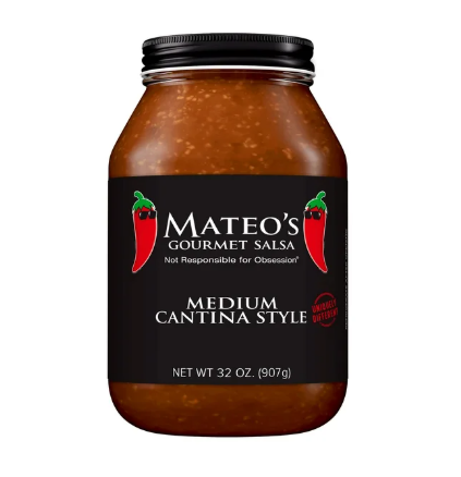 Mateo's Gourmet Cantina 16 oz of all-natural gourmet salsa per bottle; Medium Heat; Not responsible for obsession; Product of Frisco, Texas