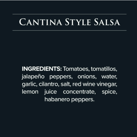 Tomatoes, Tomatillos, Jalapeno Peppers, Onions, Water, Garlic, Cilantro, Salt, Red Wine Vinegar, Lemon Juice Concentrate, Spice, Habanero Peppers.