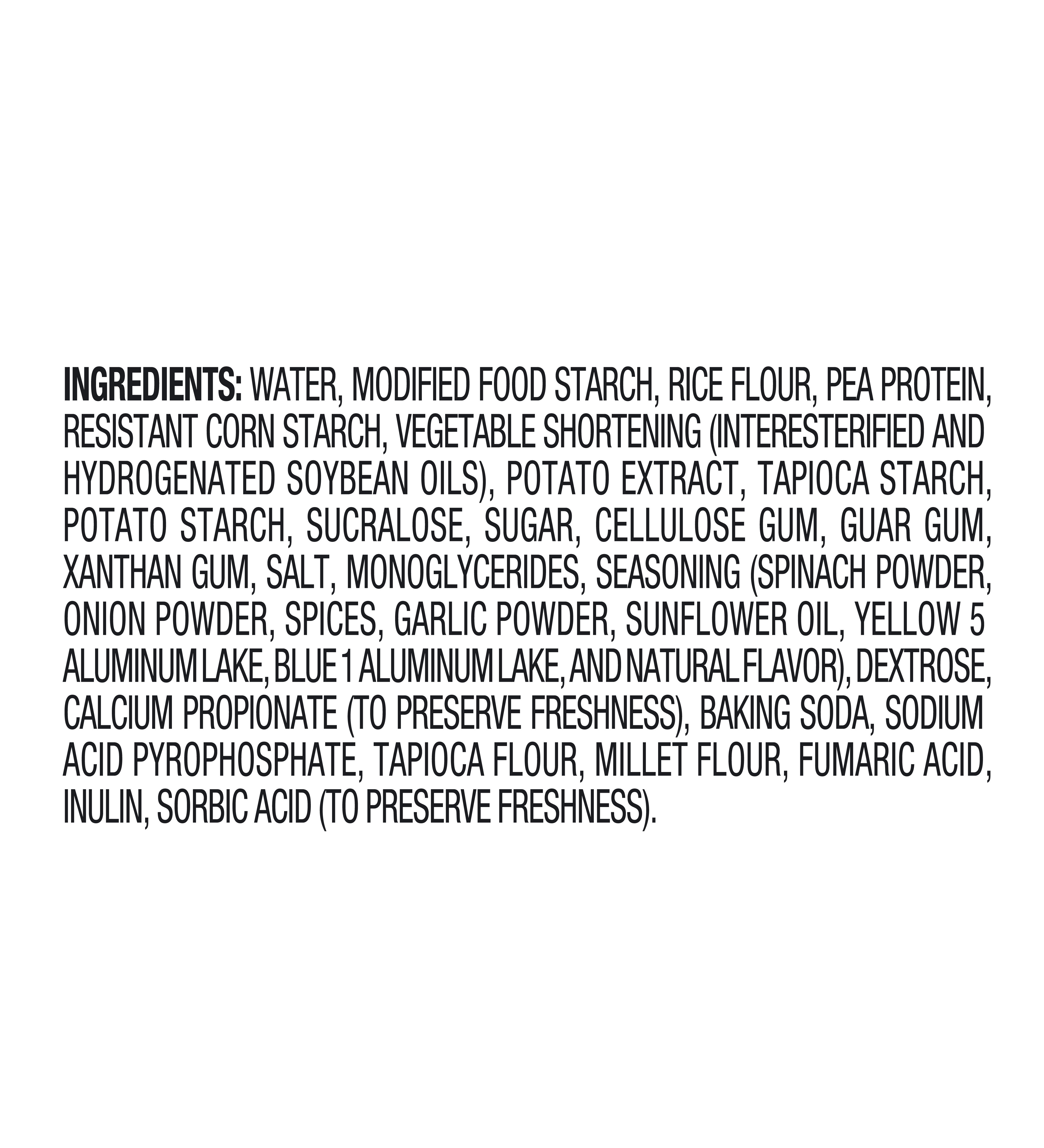 Water, Modified Food Starch, Rice Flour, Pea Protein, Resistant Corn Starch, Vegetable Shortening (Interesterified And Hydrogenated Soybean Oils), Potato Extract, Tapioca Starch, Potato Starch, Sucralose, Sugar, Cellulose Gum, Guar Gum, Xanthan Gum, Salt, Monoglycerides, Seasoning (Spinach Powder, Onion Powder, Spices, Garlic Powder, Sunflower Oil, Yellow 5 Aluminum Lake, Blue 1 Aluminum Lake, And Natural Flavor), Dextrose, Calcium Propionate (To Preserve Freshness), Baking Soda, Sodium Acid Pyrophosphate, Tapioca Flour, Millet Flour, Fumaric Acid, Inulin, Sorbic Acid (To Preserve Freshness). Contains: Soy