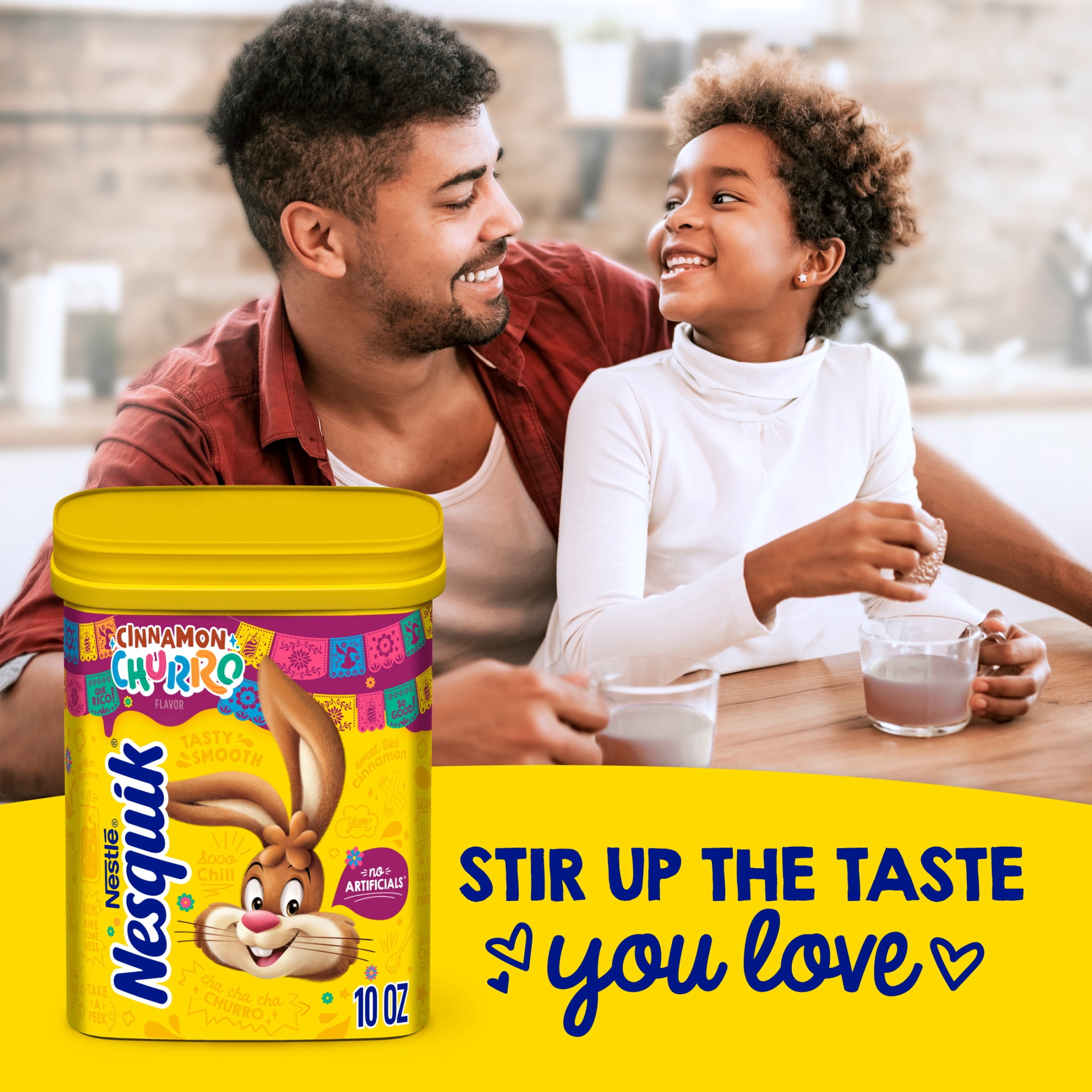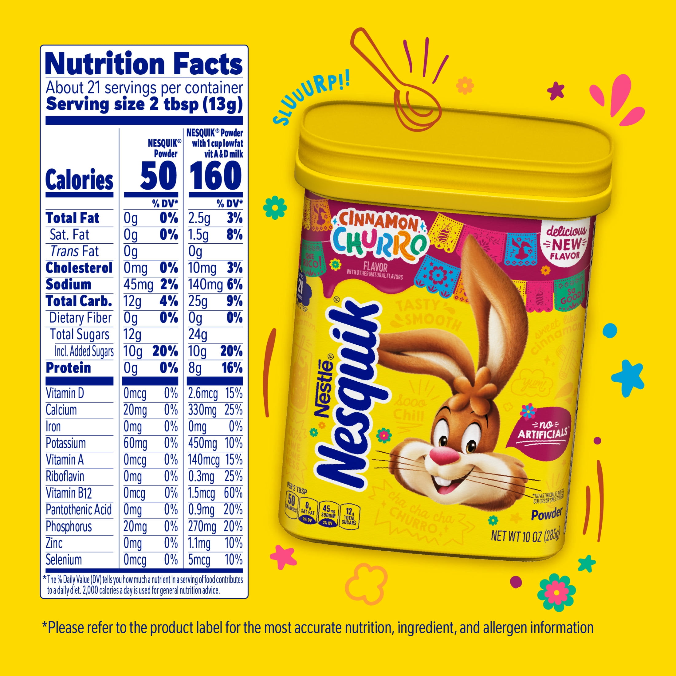 Start your day off right with Nesquik Cinnamon Churro Flavored Powder — just add two tablespoons to an eight-ounce glass of low-fat milk and stir for a sweet, nostalgic cinnamon drink. This 10 oz container includes up to 21 servings and can be enjoyed hot or cold. No artificial sweeteners, flavors, colors, or high-fructose corn syrup. Scoop, stir, and spark some greatness with every sip.