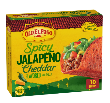 CONTAINS: One cardboard box of 10 whole Old El Paso Spicy Jalapeno Cheddar Flavored Stand 'N Stuff Taco Shells, Gluten Free, 5.4 oz