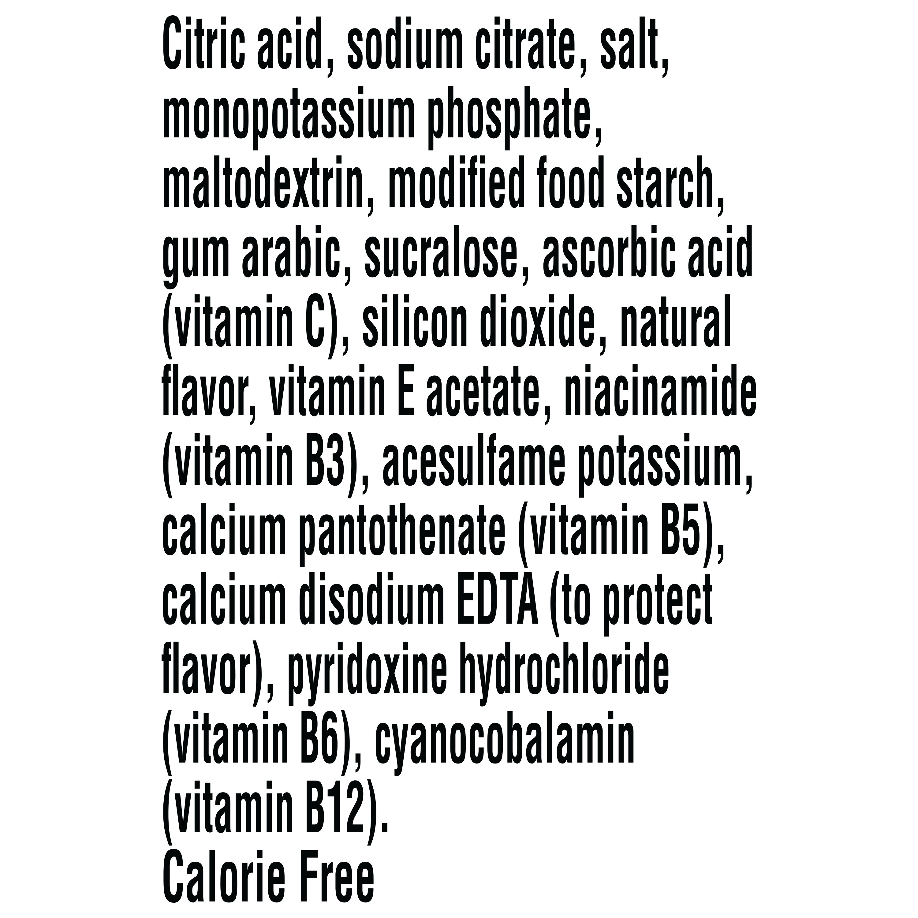 Citric Acid, Sodium Citrate, Salt, Monopotassium Phosphate, Maltodextrin, Modified Food Starch, Gum Arabic, Sucralose, Ascorbic Acid (Vitamin C), Silicon Dioxide, Natural Flavor, Vitamin E Acetate, Niacinamide (Vitamin B3), Acesulfame Potassium, Calcium Pantothenate (Vitamin B5), Calcium Disodium EDTA (to Protect Flavor), Pyridoxine Hydrochloride (Vitamin B6), Cyanocobalamin (Vitamin B12).
