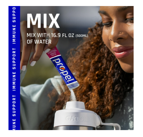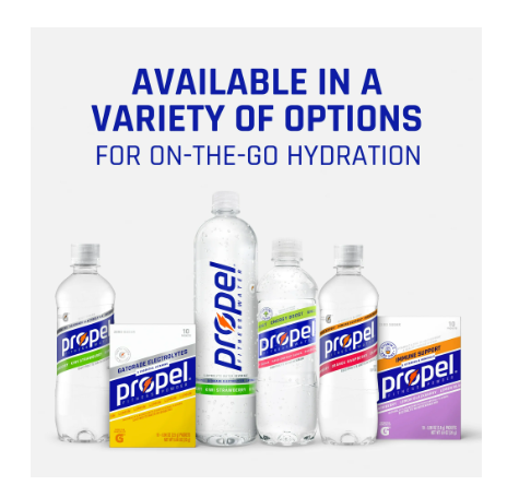 We are Propel Fitness Water – water that works harder to propel you along your fitness journey. We live and breathe to serve exercisers. Our “superpower” is our connection to Gatorade, and we fuel potential by pushing ourselves, each other, and our communities further. Propel is a zero calorie, zero sugar, fitness water made to replenish and rehydrate active lifestyles. With Gatorade electrolytes, Propel fitness water helps to replace what you lose in sweat. It's the original zero calorie electrolyte water that offers a variety of flavors and is an excellent source of vitamins B3, B5, B6, B12, C, and E.