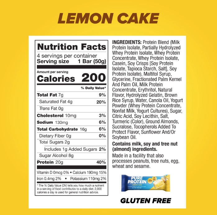 Pure Protein Lemon Cake Protein Bars are delicious high protein snacks that support lean muscle and strength. These high protein bars are gluten free, and are made with non-GMO ingredients. Each lemon protein bar contains 20 grams of protein, 190 calories, and 2 grams of sugar, for a great tasting protein snack. These bars provide high quality protein, an essential part of a nutritious, balanced diet. Additionally, these protein bars support your active lifestyle. Toss these individually wrapped lemon protein bars in your gym bag for a protein snack you can eat pre workout, post workout or on the go during a busy day. With tasty lemon cake flavor, it's easy to enjoy a Pure Protein bar any time of day. Pure Protein is proud to offer low sugar protein bars with great taste. For best results, drink 8 ounces of water or other liquid with these bars.